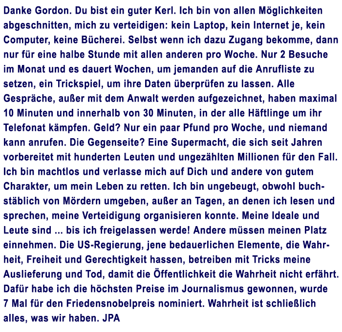 Danke! Es ist deprimierend, wie machtlos man gegenüber der Macht von Verbrechern ist. Wenn Assange verliert, haben wir alle verloren.