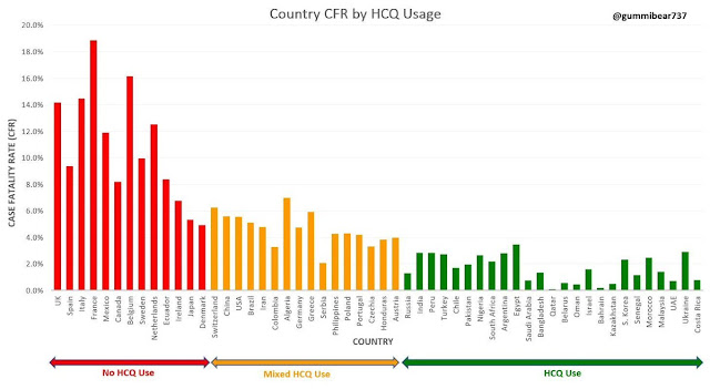 Todesrate für Länder, die kein Hydroxychloroquin verwenden in rot, Länder mit gemischter Nutzung von Hydroxychloroquin in gelb und Ländern, in denen Hydroxychloroquin verwendet wird in grün.