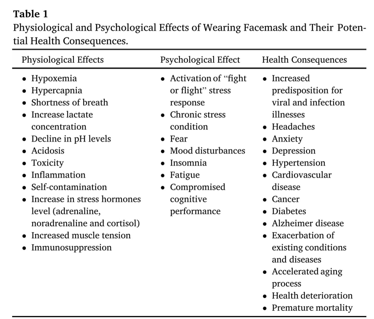 „Die vorhandenen wissenschaftlichen Beweise stellen die Sicherheit und Wirksamkeit des Tragens von Gesichtsmasken als präventive Maßnahme für COVID-19 in Frage. Die Daten legen nahe, dass sowohl medizinische als auch nicht-medizinische Gesichtsmasken unwirksam sind, um die Übertragung von Viren und Infektionskrankheiten wie SARS-CoV-2 und COVID-19 von Mensch zu Mensch zu verhindern, was gegen die Verwendung von Gesichtsmasken spricht. Das Tragen von Gesichtsmasken hat nachweislich erhebliche nachteilige physiologische und psychologische Auswirkungen. Dazu gehören Hypoxie, Hyperkapnie, Kurzatmigkeit, erhöhte Azidität und Toxizität, Aktivierung der Angst- und Stressreaktion, Anstieg der Stresshormone, Immunsuppression, Müdigkeit, Kopfschmerzen, Abnahme der kognitiven Leistungsfähigkeit, Prädisposition für virale und infektiöse Erkrankungen, chronischer Stress, Angst und Depression. Langfristige Folgen des Tragens von Gesichtsmasken können eine Verschlechterung des Gesundheitszustands, die Entwicklung und das Fortschreiten chronischer Krankheiten und einen vorzeitigen Tod verursachen. Regierungen, politische Entscheidungsträger und Gesundheitsorganisationen sollten in Bezug auf das Tragen von Gesichtsmasken einen prosperierenden und auf wissenschaftlichen Erkenntnissen basierenden Ansatz verfolgen, wenn das Tragen von Gesichtsmasken als präventive Maßnahme für die öffentliche Gesundheit betrachtet wird.“