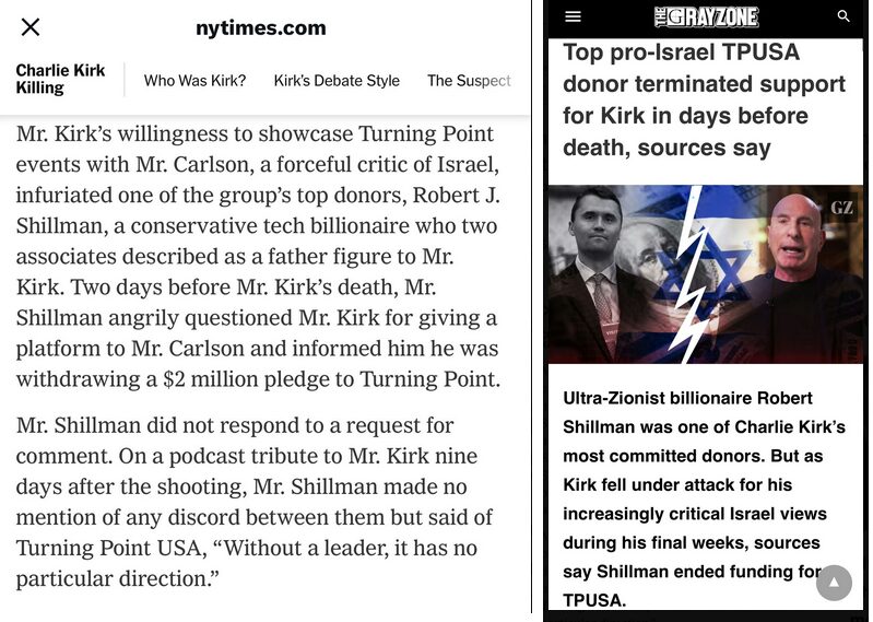 Die New York Times hat meinen Bericht vom 22. September bestätigt, in dem ich enthüllte, dass der ultrazionistische Milliardär Robert Shillman nur wenige Tage vor der Ermordung von Charlie Kirk eine große Spende an die TPUSA storniert hatte. Wie in der Vergangenheit hat die Times weder mir die Bekanntgabe der Nachricht zugeschrieben, noch einen Link zu meinem Bericht eingefügt.