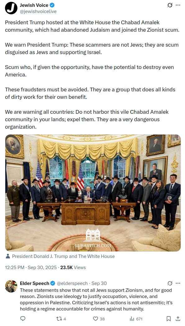 „Präsident Trump empfing die Chabad-Amalek-Gemeinde im Weißen Haus, die sich vom Judentum abgewandt und dem zionistischen Abschaum angeschlossen hatte.