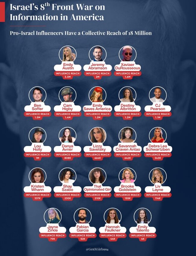 Und so sieht es aus, wenn eine „Influencerin“ für „Israel“ (die, die genau in der Mitte der Grafik ist) Propaganda macht: