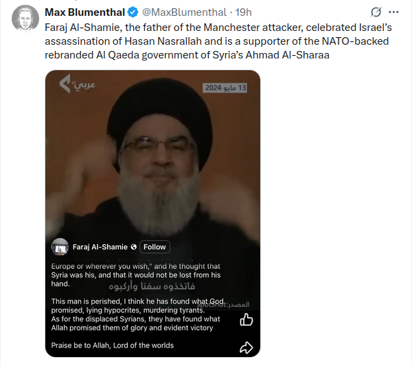 Faraj Al-Shamie, der Vater des Attentäters von Manchester, feierte die Ermordung Hasan Nasrallahs durch Israel und ist ein Unterstützer der von der NATO unterstützten, umbenannten Al-Kaida-Regierung des syrischen Ahmad Al-Sharaa.(Jolani)
