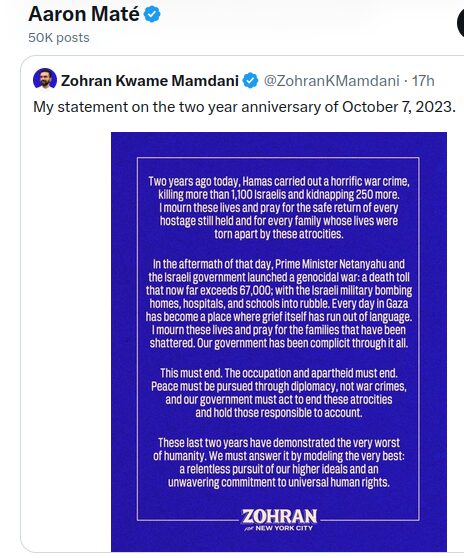Es geht in diesem Post um eine Erklärung von Zohran Kwame Mamdani, der Demokratischer Kandidat für das Amt des Bürgermeisters von NYC ist.