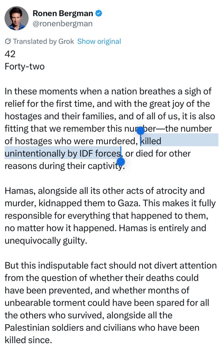 Der Korrespondent der New York Times, Ronen Bergman, räumt ein, dass viele der israelischen Gefangenen in Gaza vom israelischen Militär getötet wurden. Warum ist er so sicher, dass sie „unabsichtlich“ getötet wurden und nicht gemäß der Hannibal-Direktive, die am 7. Oktober möglicherweise Hunderte von Israelis tötete?