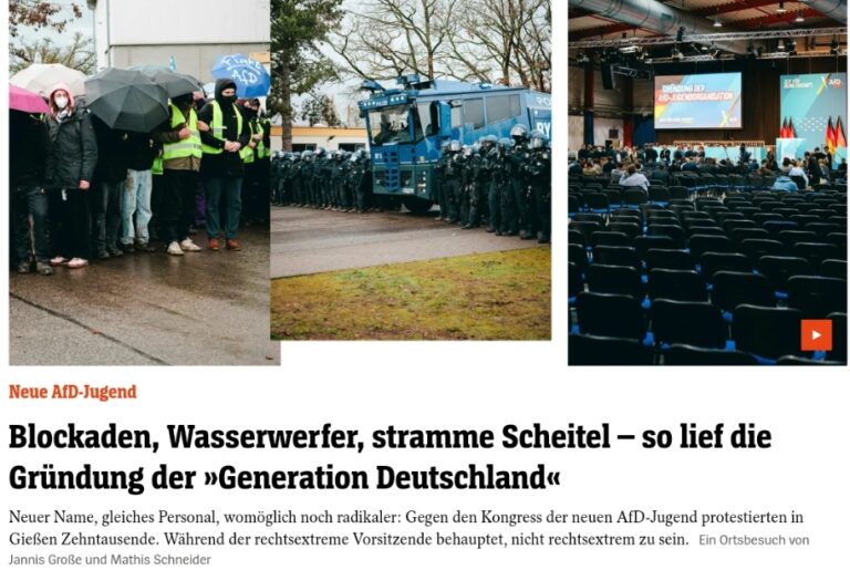 „Die neue Jugendorganisation der AfD hat sich in Gießen nach langer Debatte mit dem Namen Generation Deutschland gegründet. Bundesvorsitzender wurde Jean-Pascal Hohm. Bis zu 30.000 Menschen protestierten laut Polizei gegen die Neugründung.