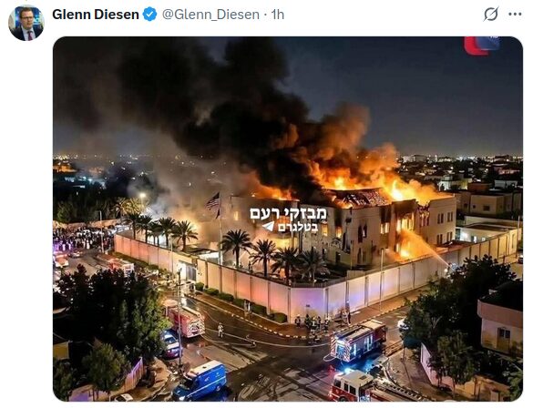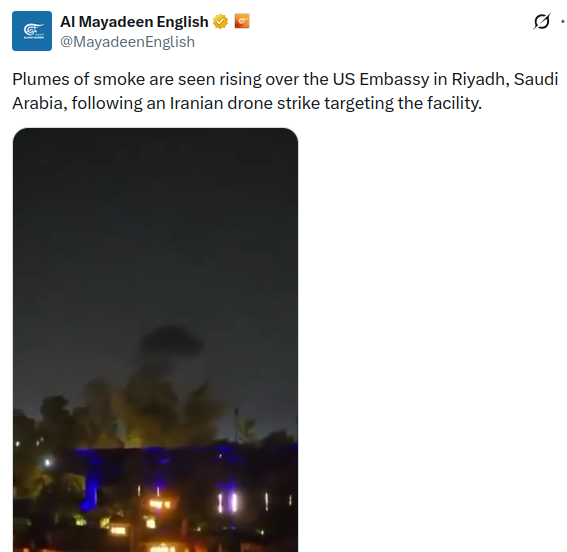 Das steht in den Community Notes zum Tweet: The US Embassy in Riyadh was hit by two drones on March 3, 2026, causing a limited fire and minor damage (no injuries), per Saudi Defence Ministry and US alerts.